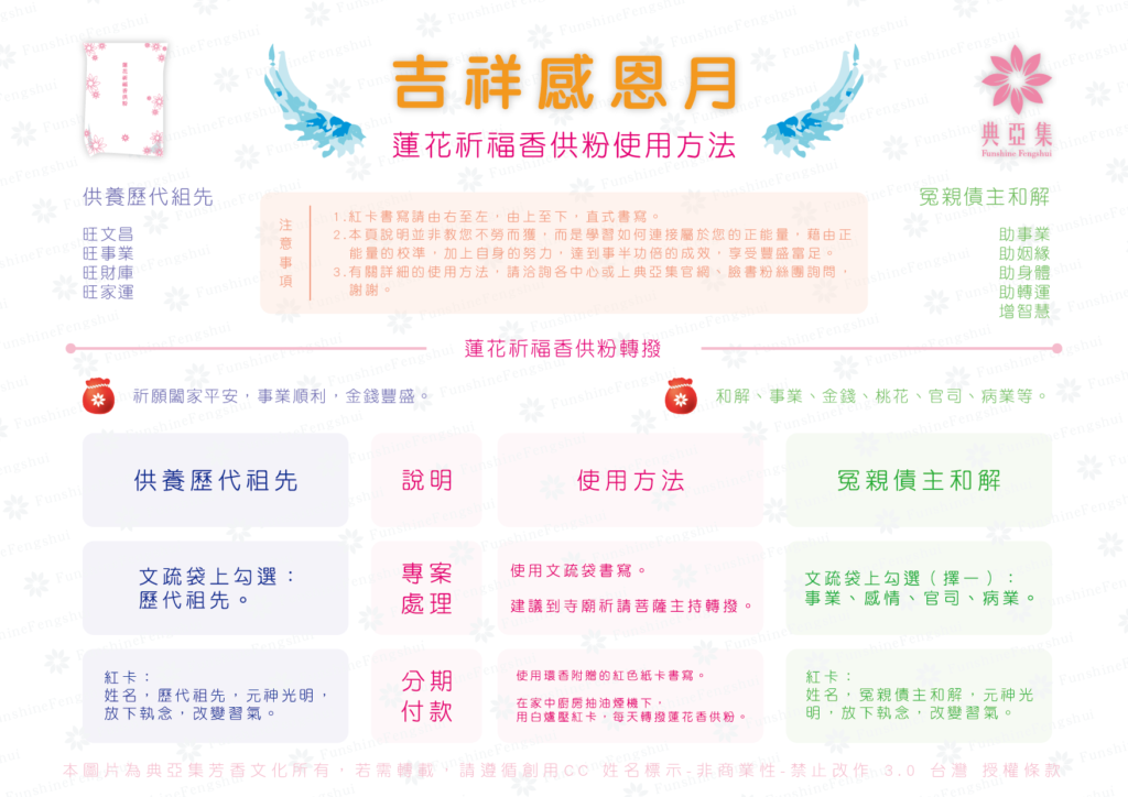無論是供養祖先、和解冤親債主、增旺文昌、消除病業、招財納福、幫助禪定、清淨陽宅、供奉土地公或地基主,都能透過祈福香供粉清淨轉化對應的能量頻率,為自己的好運增添助力!