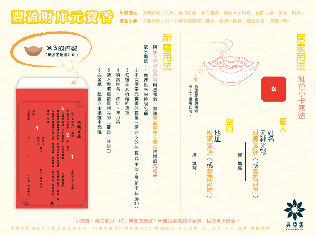 典亞集所製作的元寶香與市面上的元寶香不同,後者多以祈福和預支未來財富為主,而典亞集的元寶香除了具備祈福功能外,更強調「清淨空間場性」與「增旺豐盛財氣」兩大核心價值。